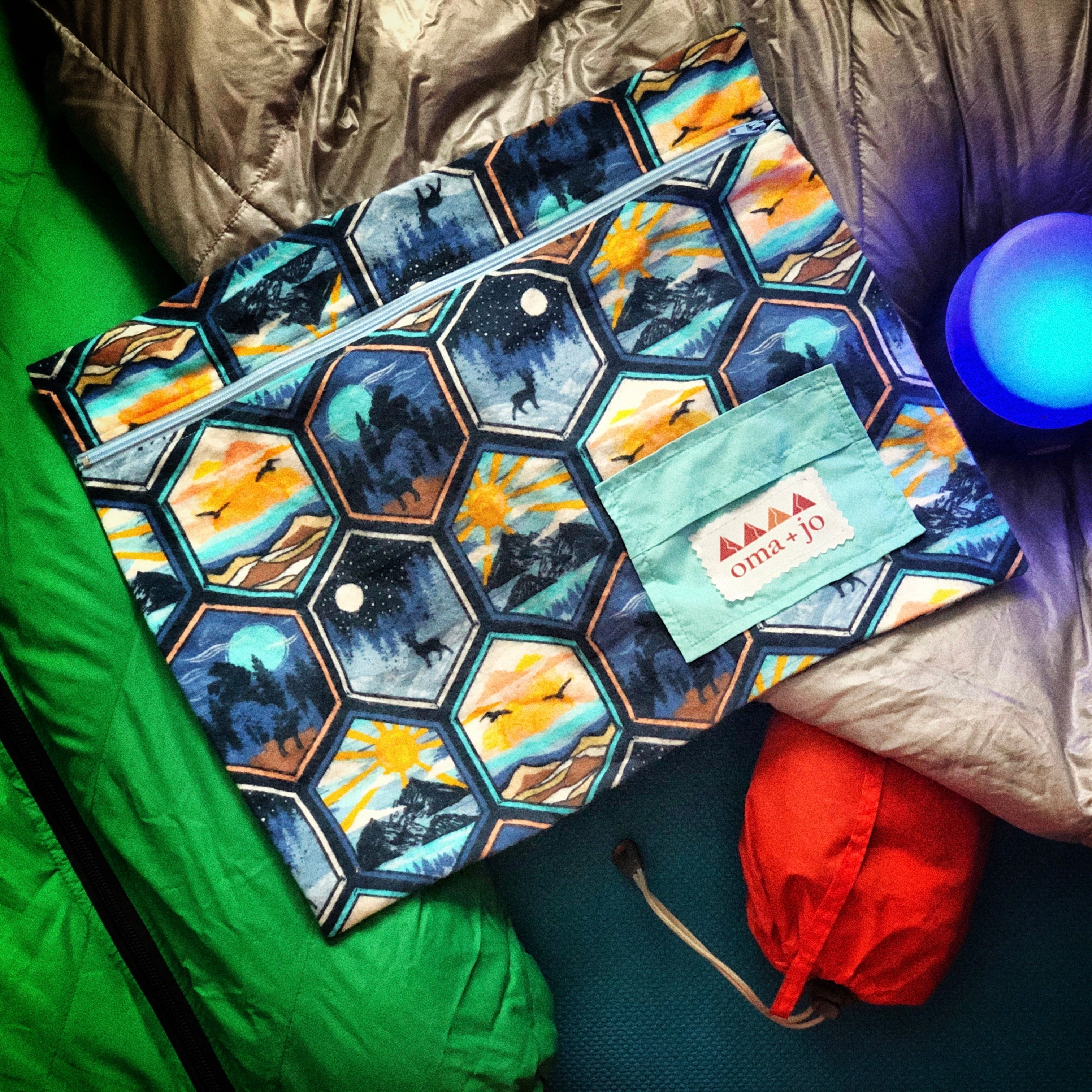 Zip closure keeps your hiking clothes organized & small pillow on the outside keeps your hair-ties, ear-buds or any other misc must have - close at hand whilst snoozin'.